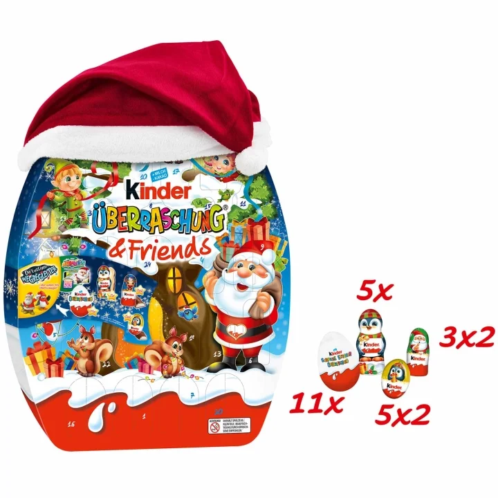 Une nouvelle surprise chaque jour – qu'il s'agisse d'un jouet dans un œuf surprise, d'une barre chocolatée ou de jolies figurines creuses : le calendrier Kinder Surprise & Friends offre le mélange parfait de plaisir et de chocolat.